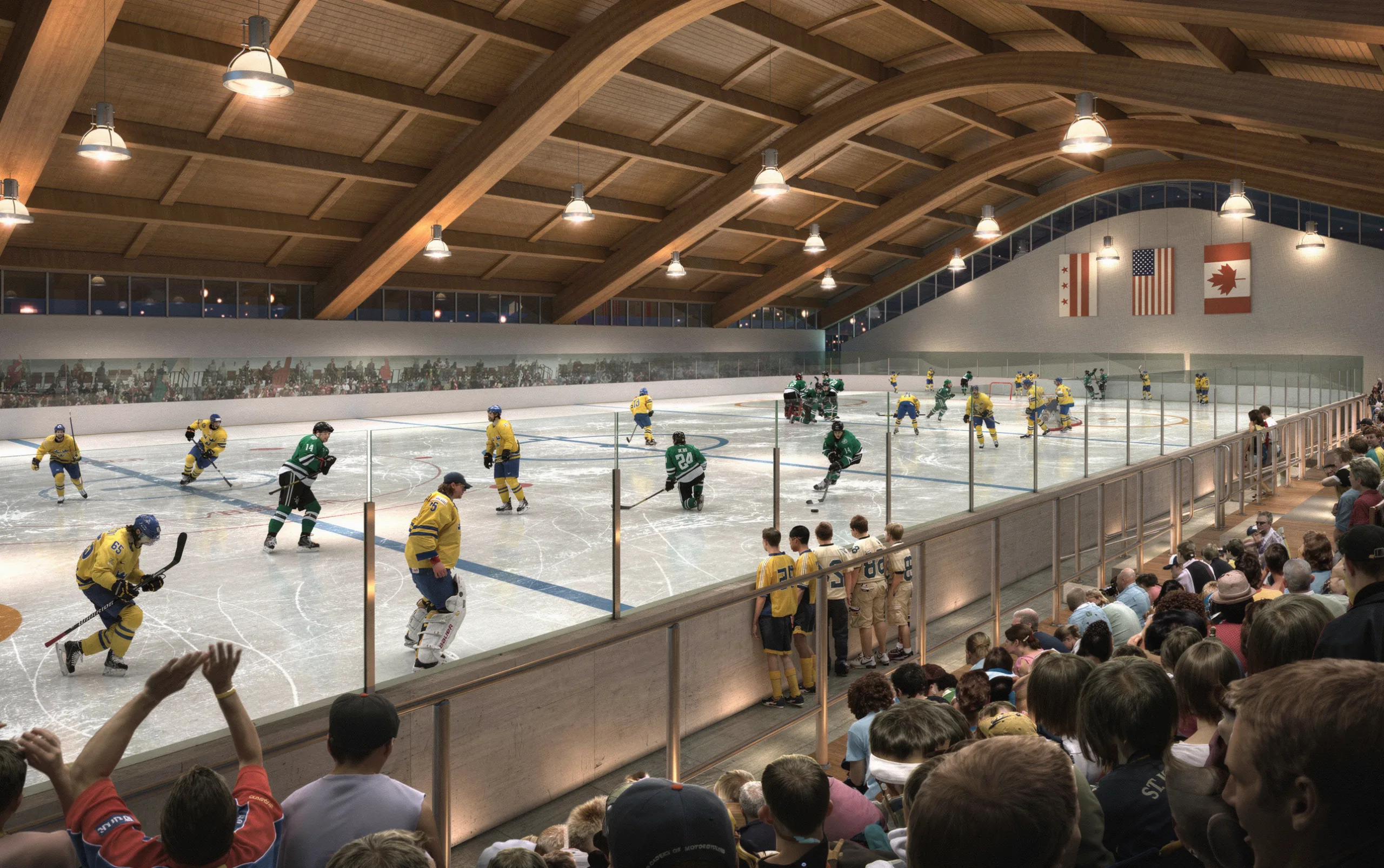 The phased design maximizes shared amenities between the two ice rinks, allowing for efficient use of space and the inclusion of essential features such as shops, locker rooms, spectator seating, storage, and offices. This consolidation of amenities contributes to the arena’s functionality and community enrichment.