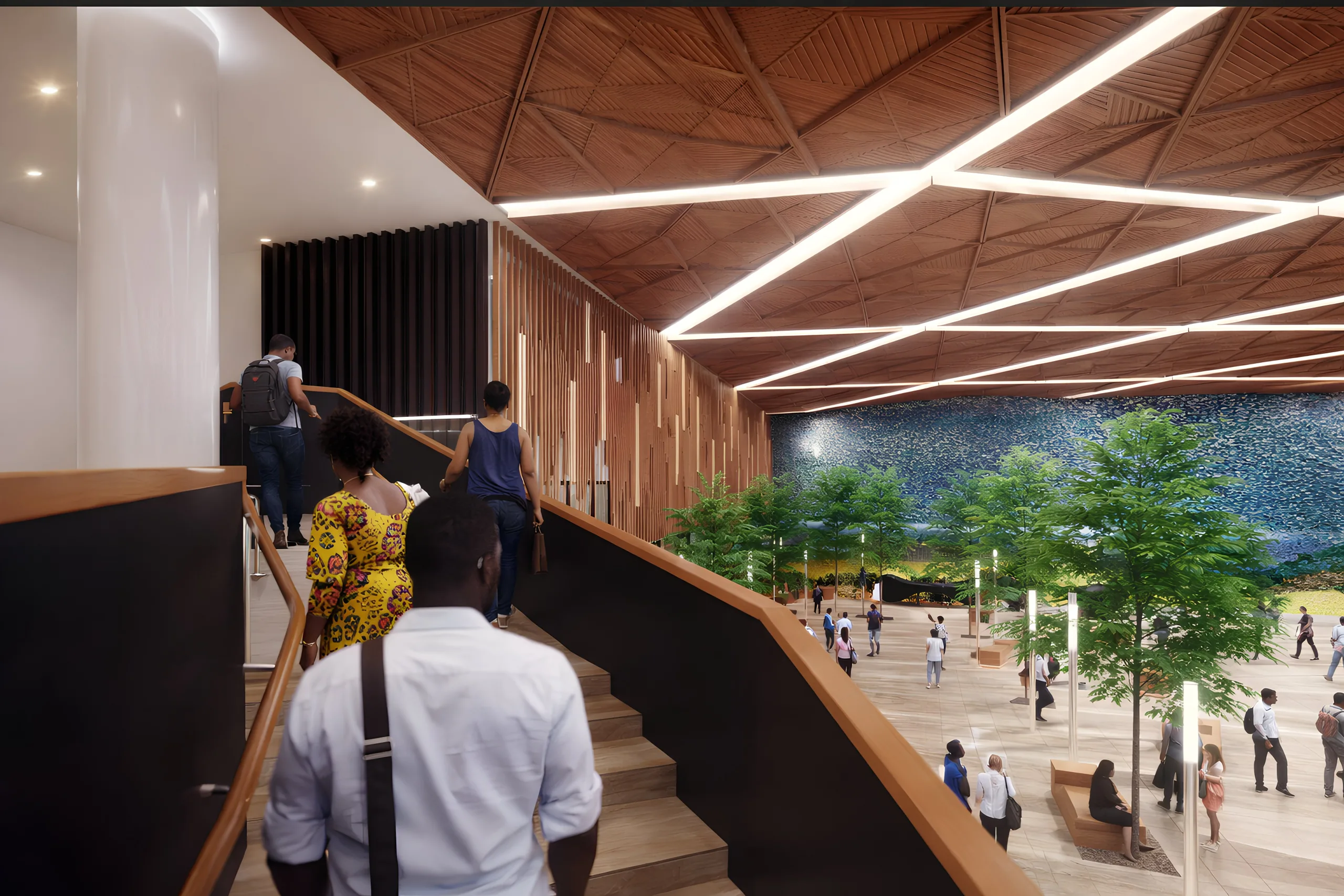 Our design proposal for the interiors of the Jamaican Houses of Parliament capitalizes on the ever-present breezes, tree groves, and sloping landscapes of Kingston by emphasizing sun, shade, shelter, and permeability, as well as celebrating the colors and shape of the Jamaican flag: gold for the sun, the green of the land, and black for the strength of the Jamaican people. When viewed in plan, the bold, black “X” formed by the lobby’s grand staircases combines with natural sunlight and a green ‘living wall’ to embody a vision of the flag in the interior architecture. Indoor trees are essential to the concept; woven throughout tile or travertine floors, they welcome Jamaica’s unmatchable landscapes indoors. The free form of the reception desk is wood-crafted; it emphasizes the main color palette while also supporting public engagement. Behind the desk, a mosaic tile installation showcases the pride of Jamaican art.
