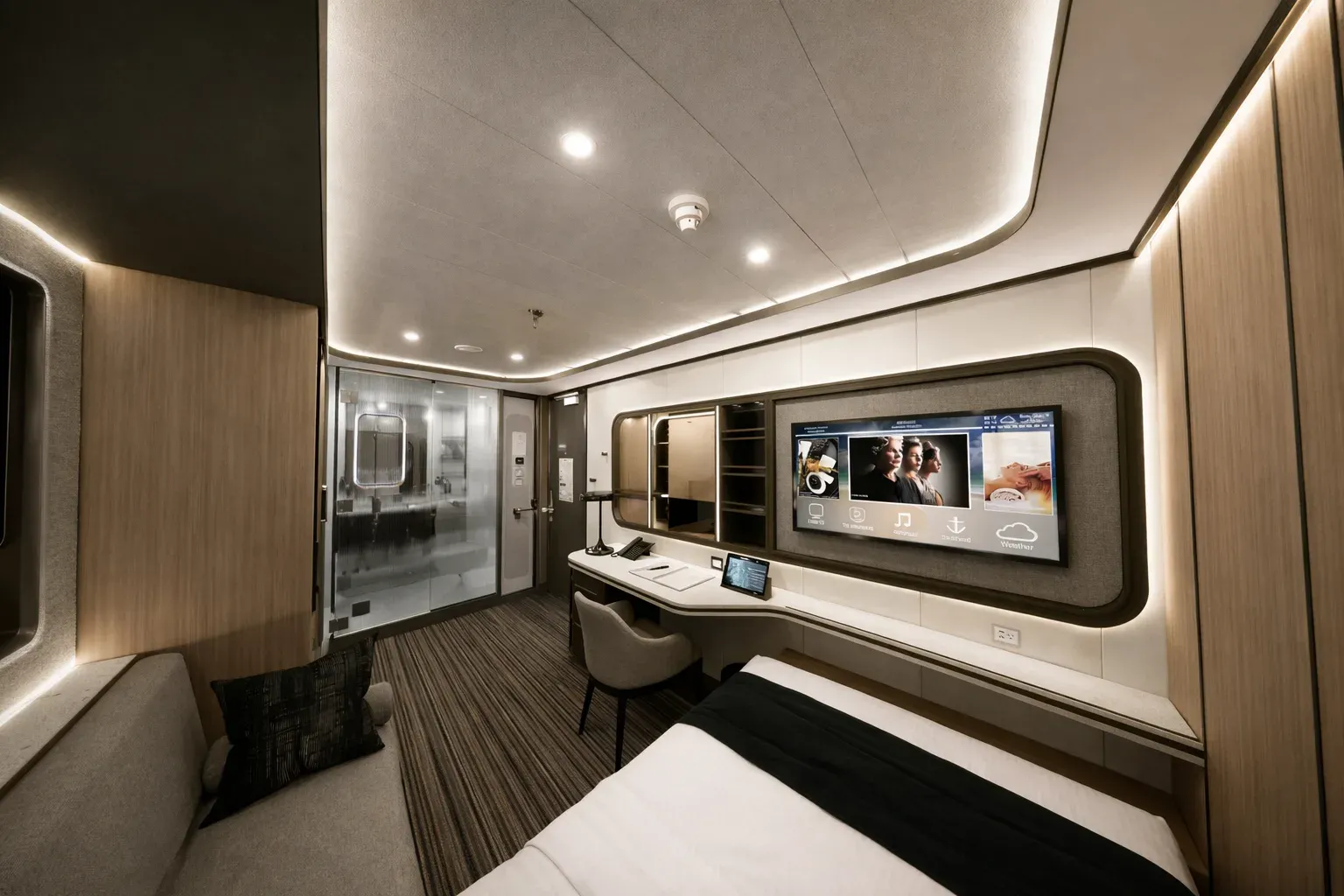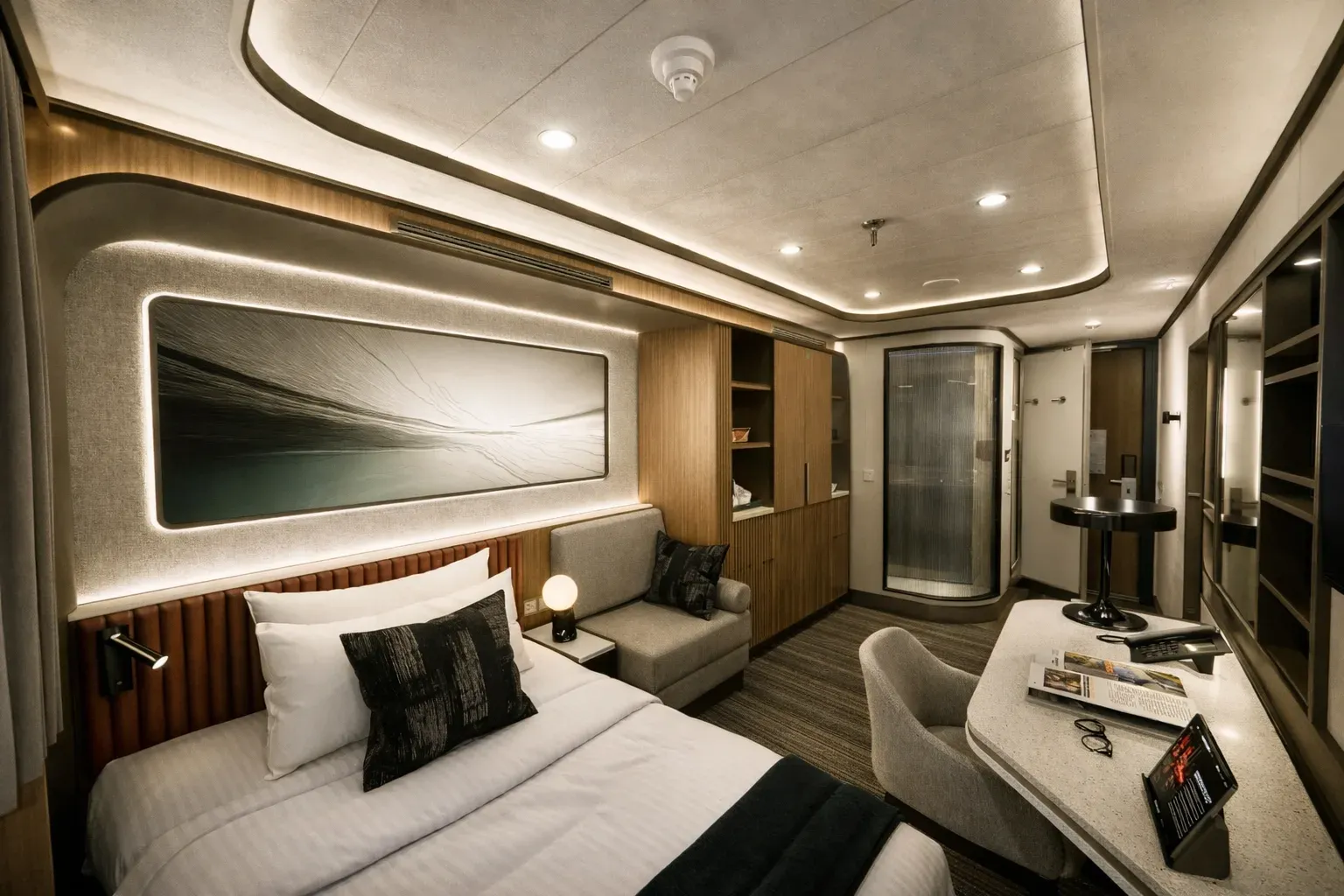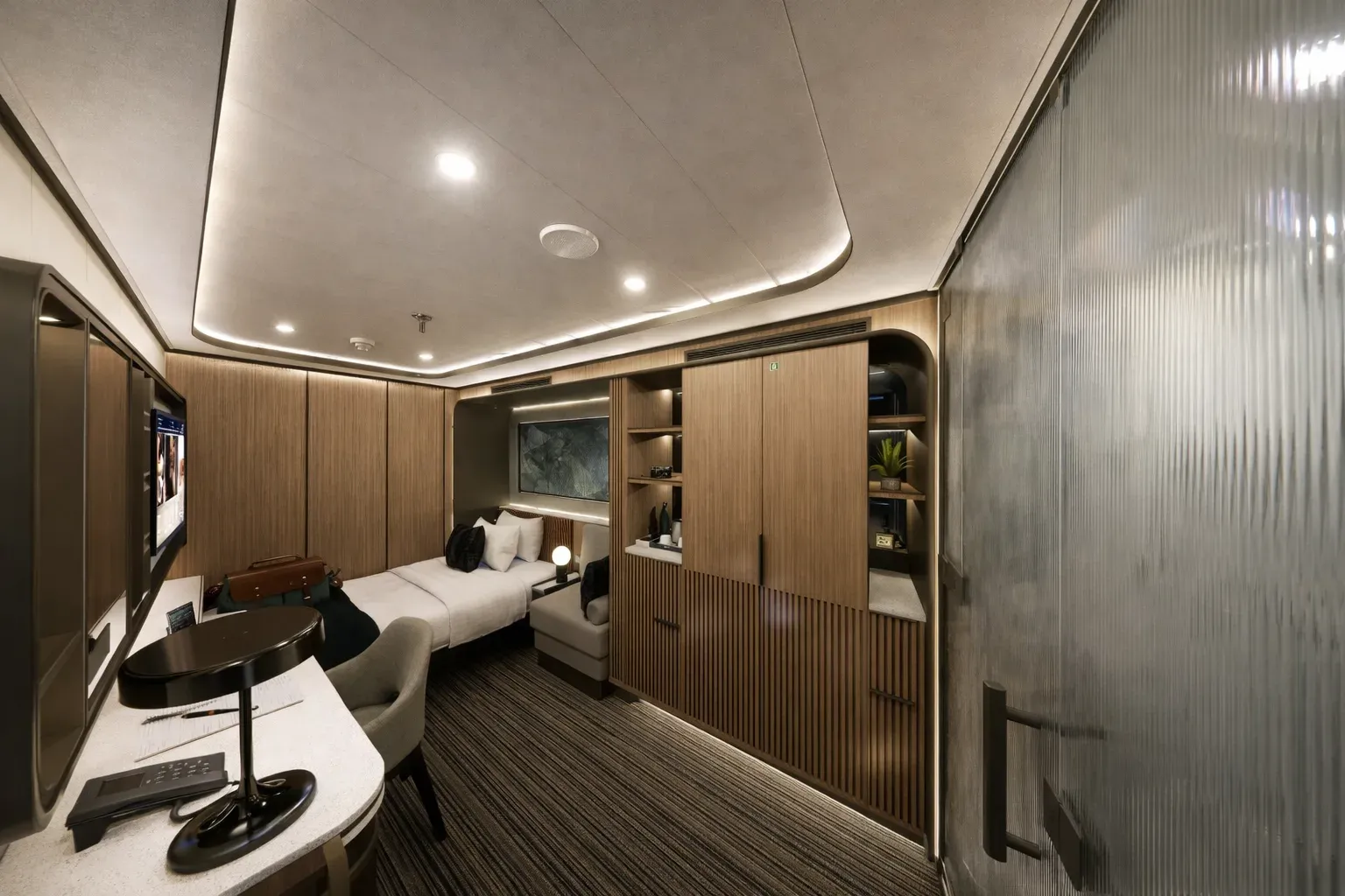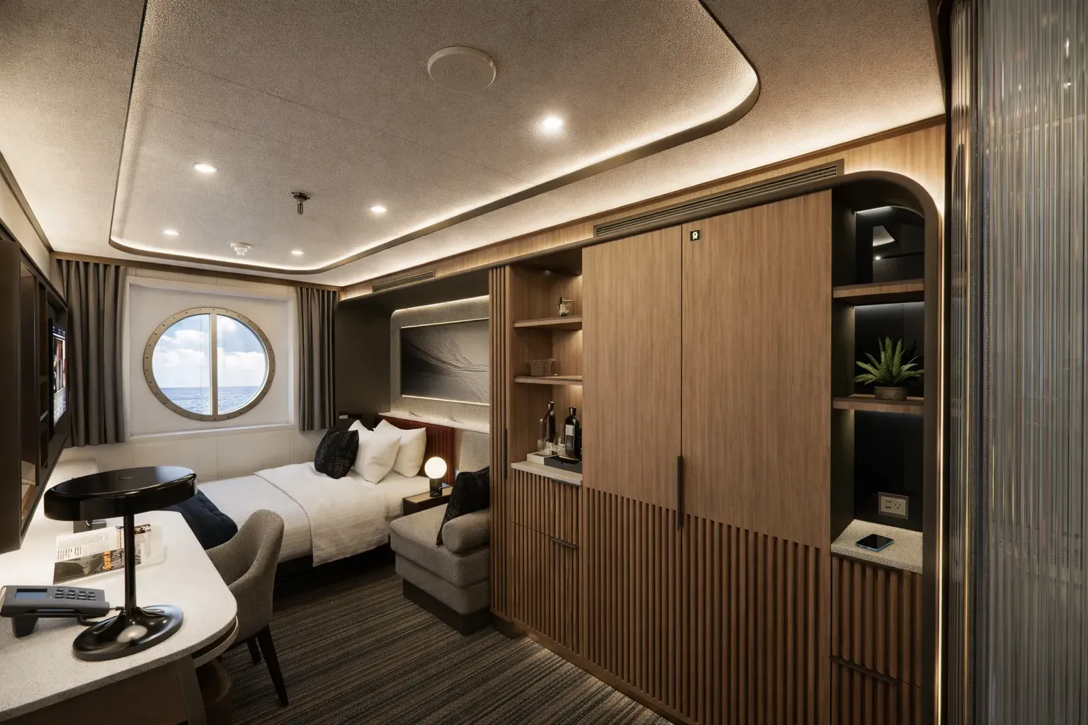 The collection includes three cabin typologies — interior, oceanview, and balcony — each designed with a neutral finish palette, warm wood accents, and medium bronze detailing. Layered lighting options and custom millwork contribute to a sense of comfort and flexibility in a compact footprint. Each unit includes a three-quarters XL bed, single-seat lounger, and a desk that doubles as a vanity. Integrated storage includes open shelving, concealed compartments, a mini-fridge, and a safe.