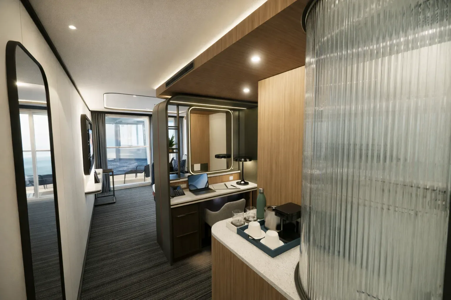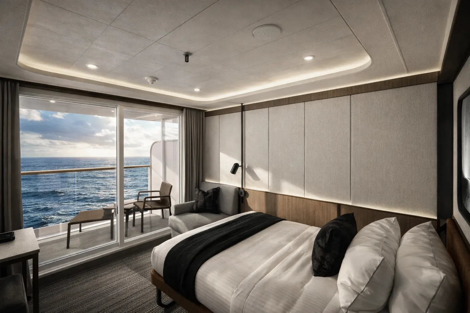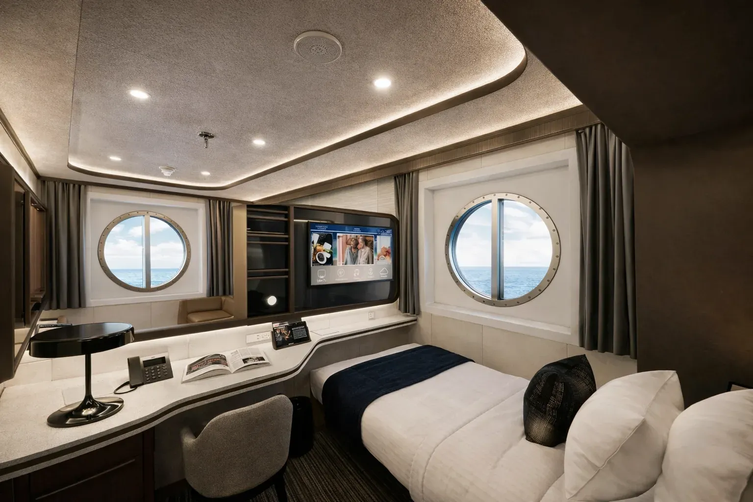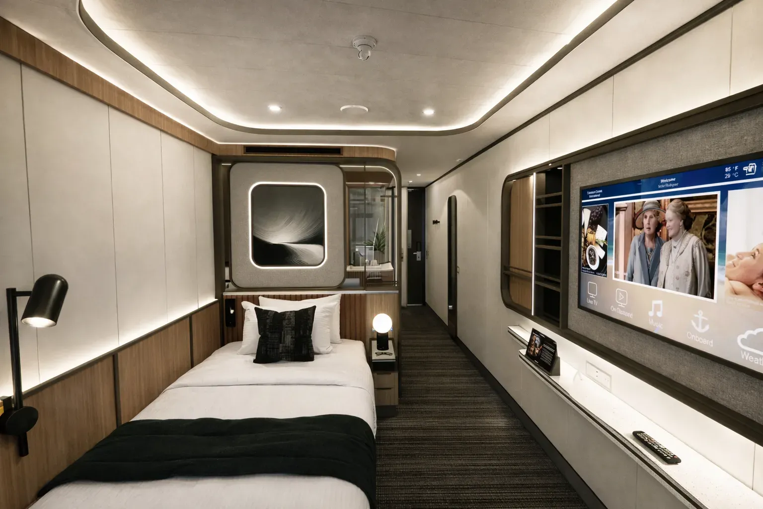 The collection includes three cabin typologies — interior, oceanview, and balcony — each designed with a neutral finish palette, warm wood accents, and medium bronze detailing. Layered lighting options and custom millwork contribute to a sense of comfort and flexibility in a compact footprint. Each unit includes a three-quarters XL bed, single-seat lounger, and a desk that doubles as a vanity. Integrated storage includes open shelving, concealed compartments, a mini-fridge, and a safe.
