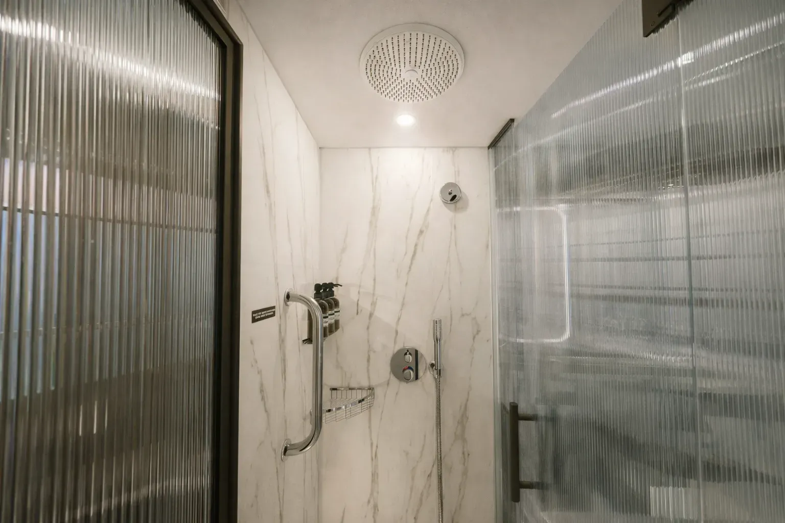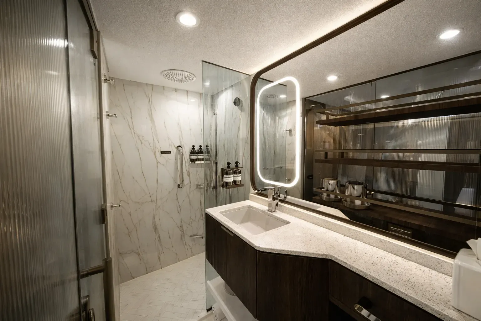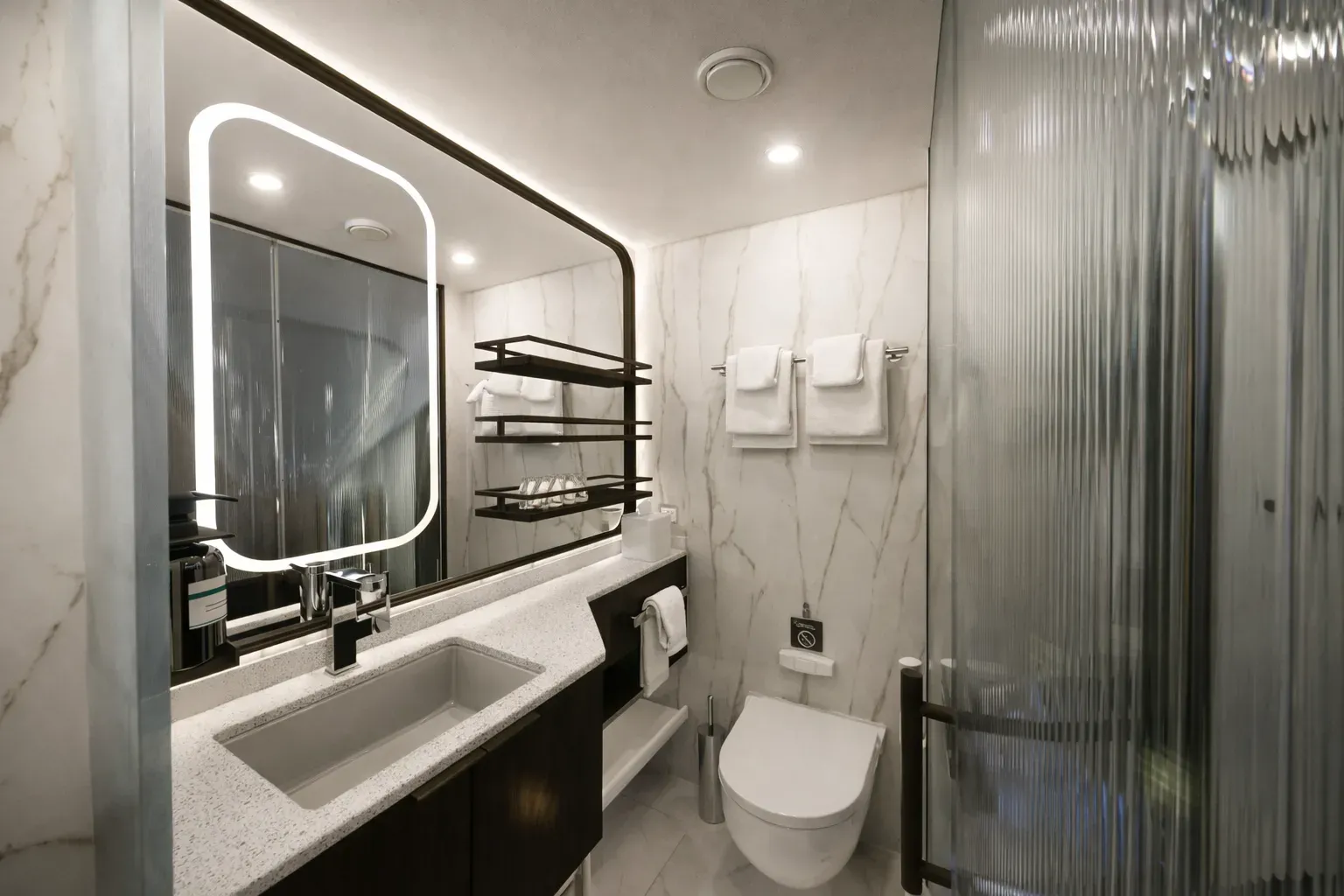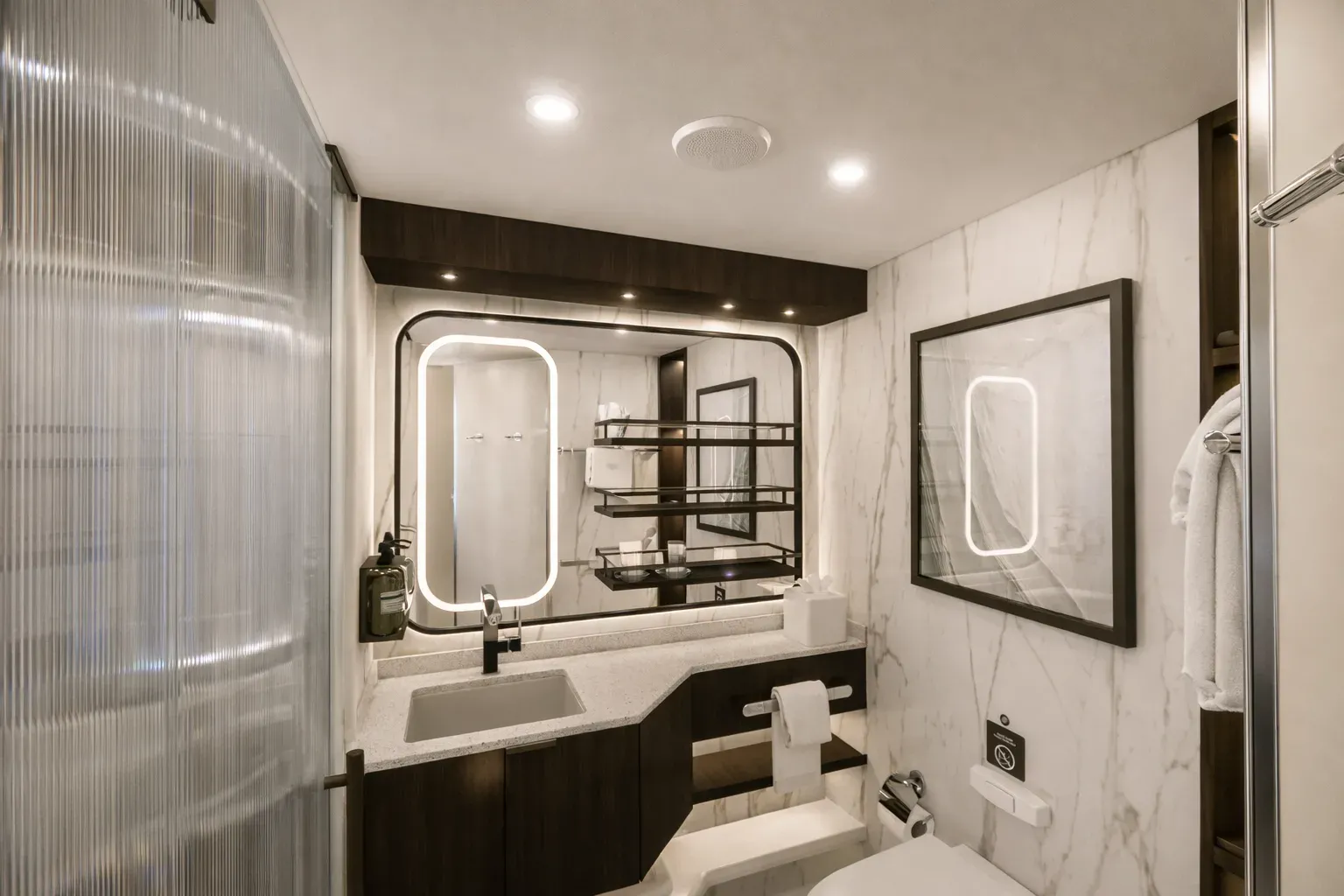 Bathrooms are light and efficient, featuring rainfall showers and marine-grade finishes that are both durable and refined. All cabins are equipped with a digital tablet to control lighting, climate, and in-room entertainment — aligning with evolving guest expectations in modern cruise design.