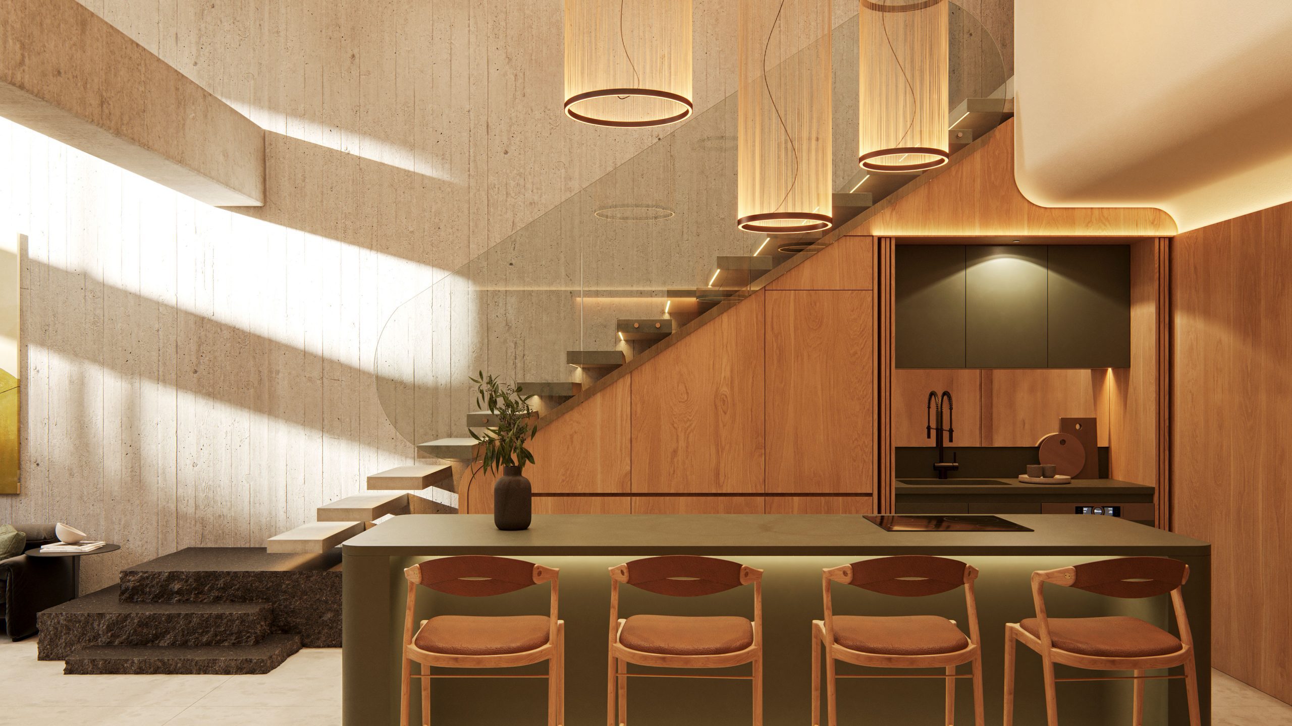 The six private suites are designed as calming sanctuaries, each with curated amenities for modern living—kitchens, laundry, workspaces—and supported by shared spaces that foster connection and ease.