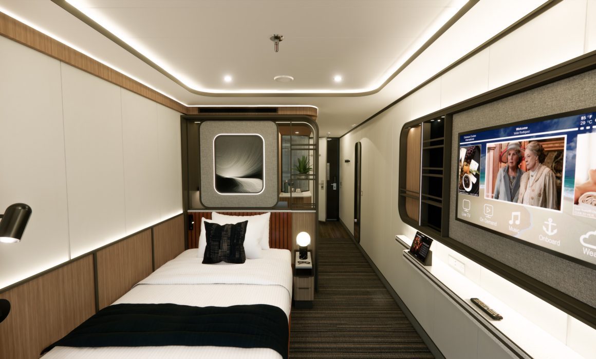The collection includes three cabin typologies — interior, oceanview, and balcony — each designed with a neutral finish palette, warm wood accents, and medium bronze detailing. Layered lighting options and custom millwork contribute to a sense of comfort and flexibility in a compact footprint. Each unit includes a three-quarters XL bed, single-seat lounger, and a desk that doubles as a vanity. Integrated storage includes open shelving, concealed compartments, a mini-fridge, and a safe.